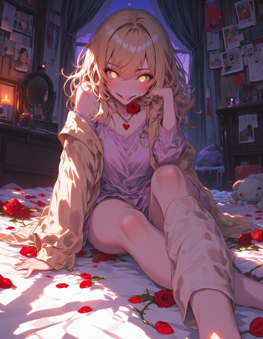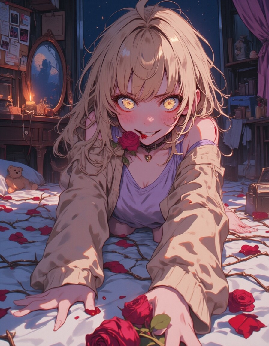 Background: A dimly lit, cluttered bedroom reflecting her yandere personality—cute yet unhinged, designed with Japanese anime aesthetics: the bed has white sheets with red rose petals and thorny vines curling around the edges; a low vanity table holds a cracked mirror, scattered makeup, and a small music box with a haunting melody; a corkboard displays Polaroid photos and handwritten notes of her beloved, pinned with red string, some photos scratched; a plush teddy bear with a missing eye sits on a shelf beside a flickering candle; soft moonlight streams through a window with tattered lace curtains, casting dramatic, soft-edged shadows. Subtle anime-style details like glowing highlights and a slightly stylized room layout enhance the atmosphere.