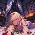 Situation: A POV view of a yandere girl on a bed, crawling slowly towards the viewer with an intense, obsessive gaze, her body low and movements deliberate. Her expression is a haunting mix of adoration and menace, with large, shimmering golden eyes, slightly dilated pupils reflecting her madness, a faint crooked smile, and a single drop of blood on her lip from the thorny rose clenched between her teeth.