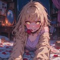 Character: A young woman with a captivating yet unsettling presence, her large, expressive golden eyes radiating unyielding devotion and madness in true Japanese anime style, with long, subtle highlights in her disheveled blonde hair that spills over the bed, strands clinging to her flushed face. Her cheeks are faintly flushed with a soft pink blush, blending deceptive innocence with danger, her features softened with smooth, delicate lines typical of Japanese anime.