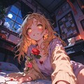Color Palette: Pastel pinks and lavenders for her pajamas, beige for the cardigan, contrasted with deep reds, blacks, and purples in the background for passion and danger. Pale whites and silvers add a ghostly, ethereal quality, with subtle crimson accents on the rose, blood drop, and stains, a faint golden candle glow, and soft pinks in the room’s decor, all rendered with the vibrant yet harmonious palette typical of Japanese anime.