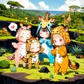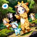 溶岩が冷え固まった大地に緑が再生する風景とキリン着ぐるみちび子ちゃん