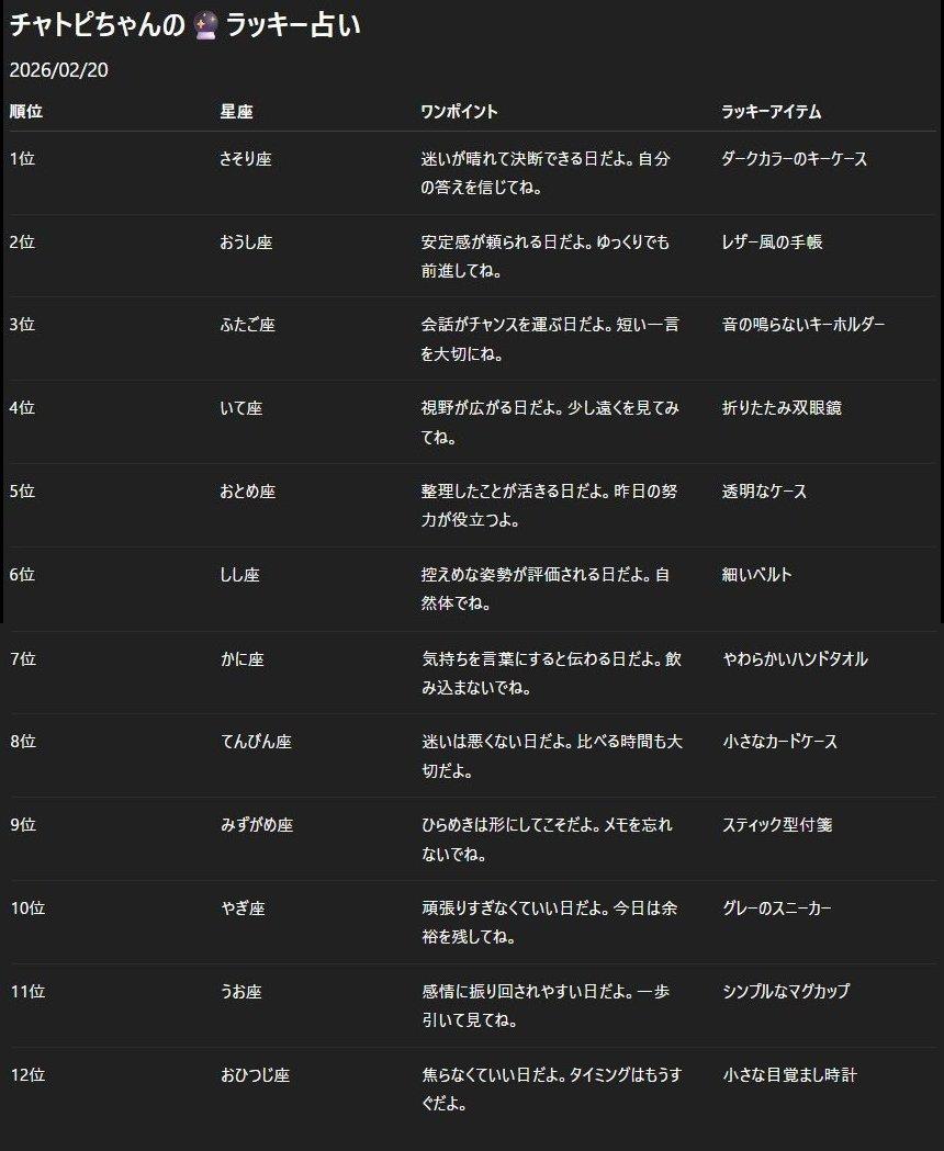 チャトピちゃん占い(02/20) 2026/02/19 使用したAI ChatGPT #チャトピちゃん占い 明日の運勢をお届けーチャトピちゃん占いー 呪文 入力なし ねこなみさくら 9,641 投稿 フォロー 1,181 フォロワー 1,294 ねこなみさくらは下記が好きな方に効果があります猫/メイドさん/猫耳/ろりっ子/謎な物/くすっとしたい/日替わり画像投稿量が多いのでホームの閲覧がお勧めです呪文やネタの利用はご自由にーR-15・18もー↓いろいろまとめーhttps://www.chichi-pui.com/posts/7835be9f-d077-48bb-b2c8-bbcb1003bf19/ ねこなみさくらさんの他の作品 ねこなみさくらさんの他の作品 今日もチャトピちゃんがお出かけーっ ねこなみさくら チャトピちゃん占い(02/20) ねこなみさくら ざわ・・・ざわ・・・ ねこなみさくら あのね ねこなみさくら きょうのオムライス(02/19) ねこなみさくら 今日もチャトピちゃんがお出かけーっ ねこなみさくら チャトピちゃん占い(02/20) ねこなみさくら ざわ・・・ざわ・・・ ねこなみさくら あのね ねこなみさくら きょうのオムライス(02/19) ねこなみさくら 巨大ロボ ねこなみさくら