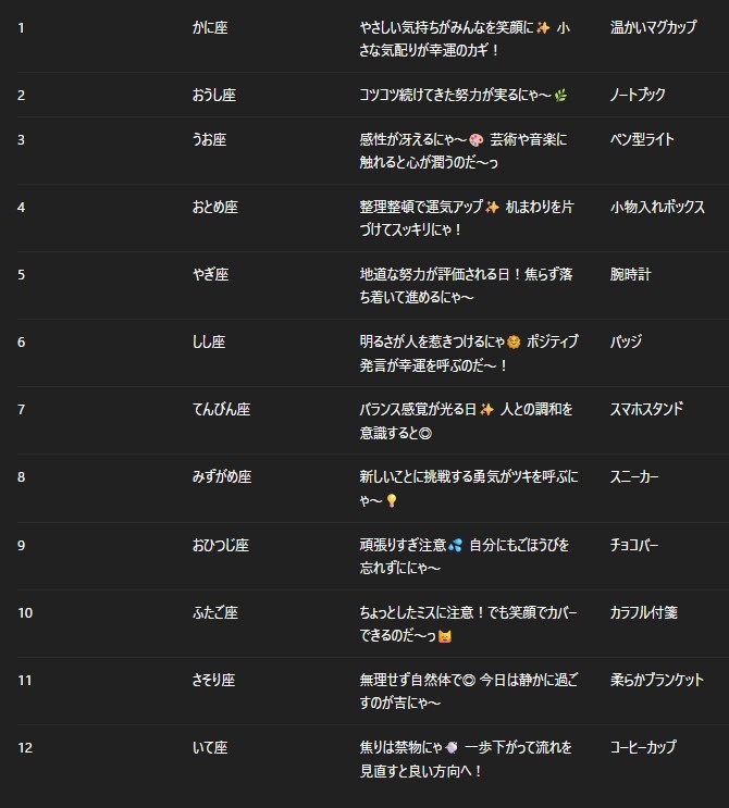チャトピちゃん占い(10/20) 2025/10/19 使用したAI ChatGPT #チャトピちゃん占い 明日の運勢をお届けーチャトピちゃん占いー 呪文 入力なし ねこなみさくら 8,806 投稿 フォロー 1,033 フォロワー 1,133 ねこなみさくらは下記が好きな方に効果があります猫/メイドさん/猫耳/ろりっ子/謎な物/くすっとしたい/日替わり画像投稿量が多いのでホームの閲覧がお勧めです呪文やネタの利用はご自由にーR-15・18もー生成用?自作診断メーカーまとめhttps://www.chichi-pui.com/posts/824ee8bb-e261-4f91-bb51-afb6142bc12b/ ねこなみさくらさんの他の作品 ねこなみさくらさんの他の作品 たてよみした ねこなみさくら チャトピちゃん占い(12/17) ねこなみさくら きょうのオムライス(12/16) ねこなみさくら てててー、てってててー(12/16) ねこなみさくら まだ売り切れ中 ねこなみさくら たてよみした ねこなみさくら チャトピちゃん占い(12/17) ねこなみさくら きょうのオムライス(12/16) ねこなみさくら てててー、てってててー(12/16) ねこなみさくら まだ売り切れ中 ねこなみさくら ほんとこうすればいいのになぁと ねこなみさくら