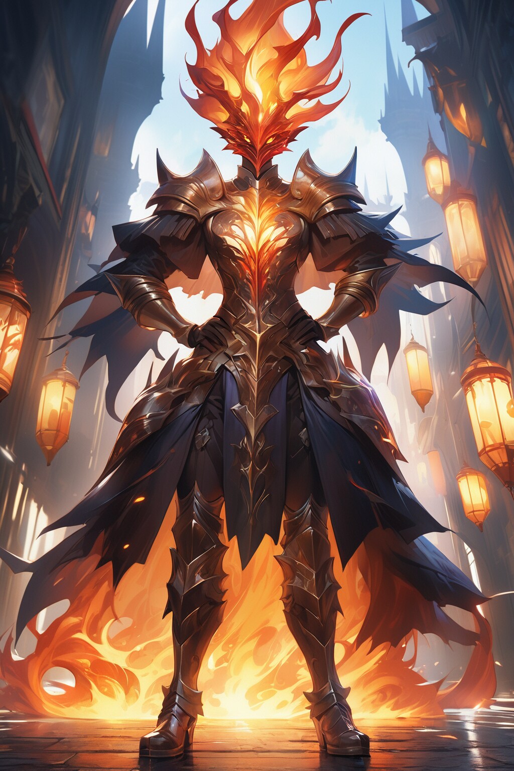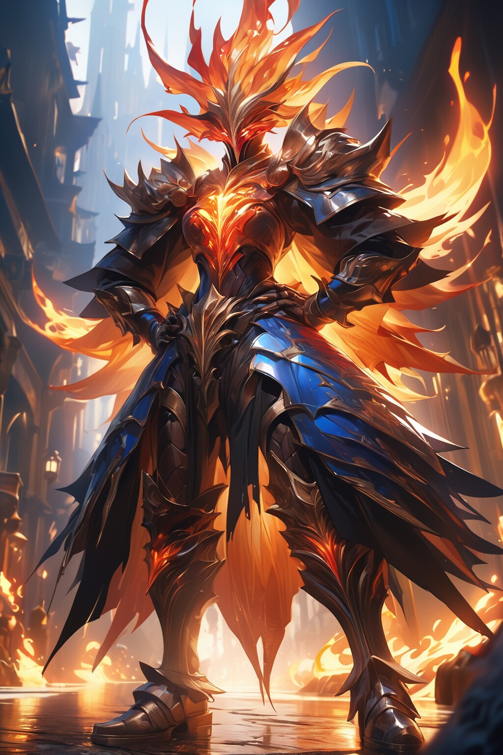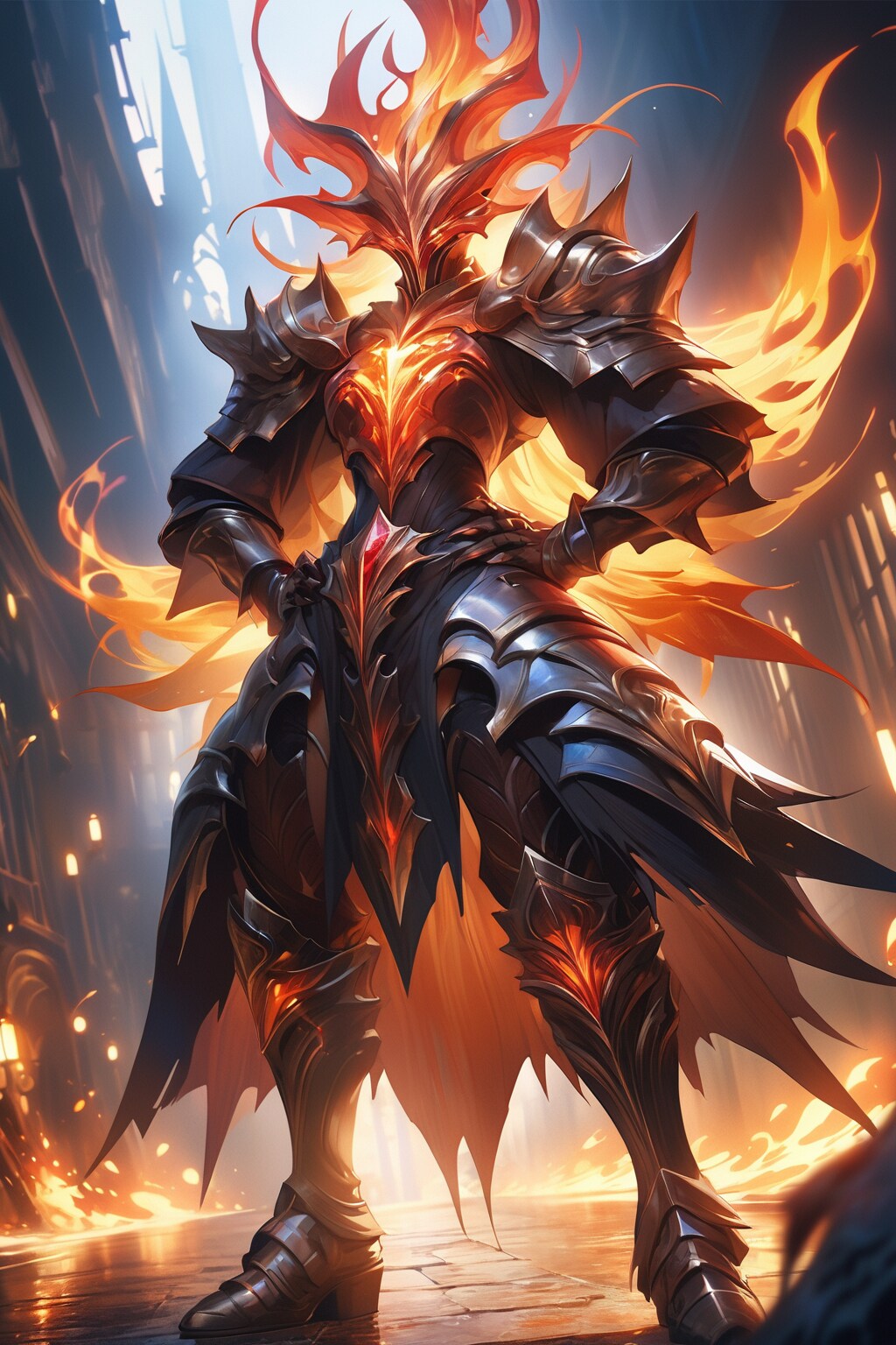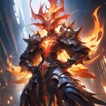 インフェルノ・ナイトは、暗黒と炎の力を象徴するような存在です。彼の体を覆う装甲は、まるで溶岩のように赤く輝き、熱を放っています。頭部の兜からは炎が立ち上り、敵に恐怖を与えます。全体的にダークで威圧的な雰囲気を持ち、火のエネルギーがその周囲に漂っています。