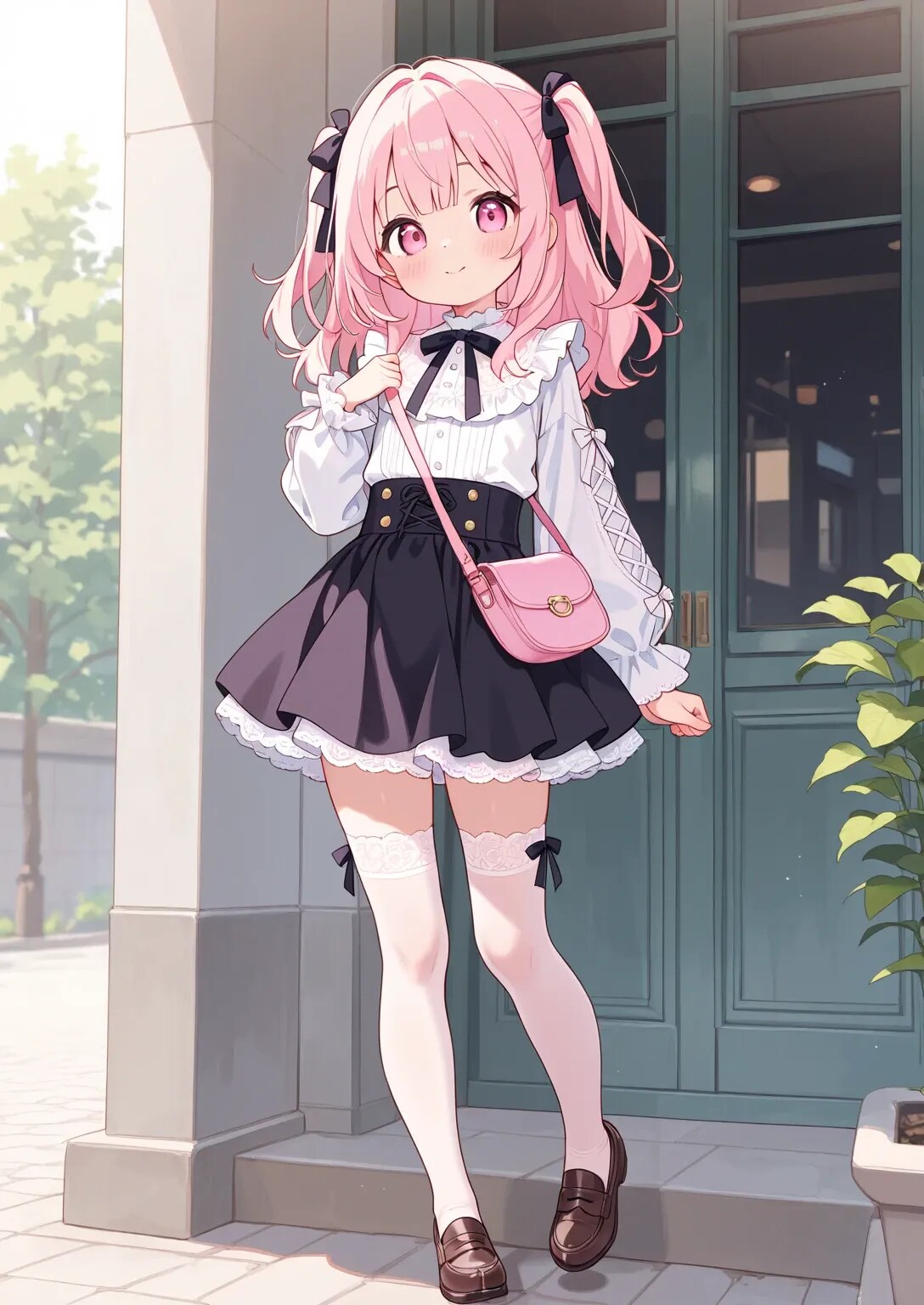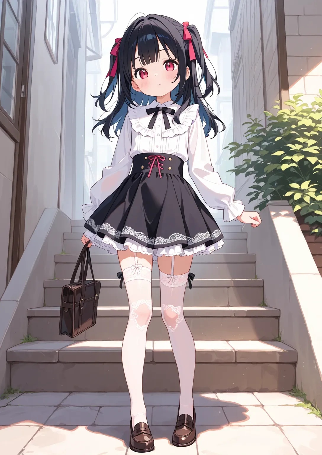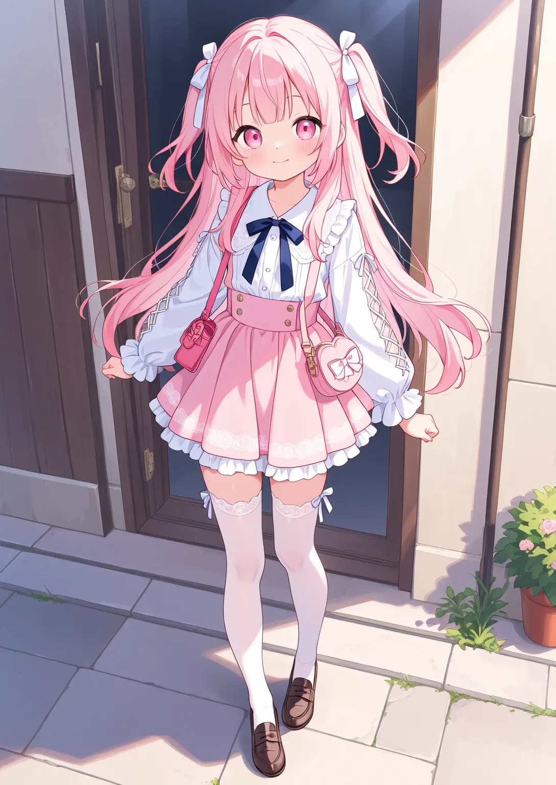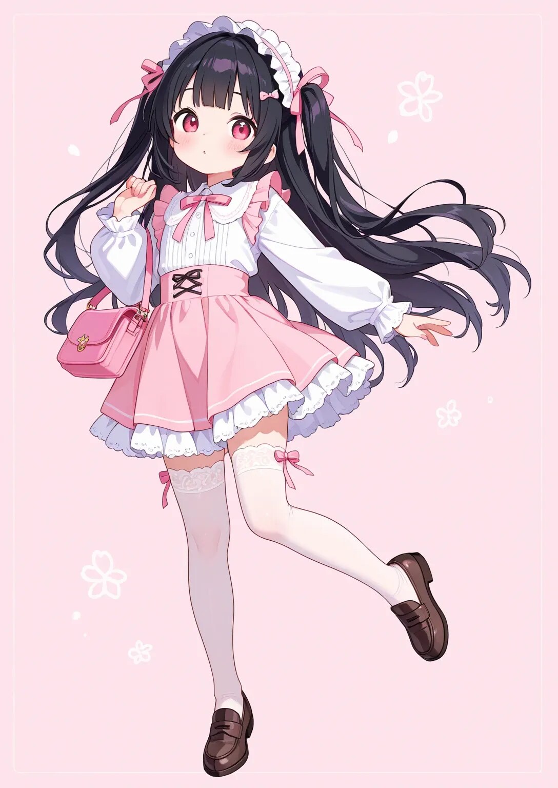 最高傑作、超高解像度、8K、16:9、ハイクオリティ、ディテール、日本人、可愛い、キュート、幼い、子供、低年齢、低学年、女児、ハーフツインヘア、リボン、量産型ファッション、パステルカラー、フリル、フリフリ、ハイウエストミニスカート、フロントレースアップデザイン、白レース刺繍ニーハイストッキング、厚底ローファー、パステルピンクのランドセル、