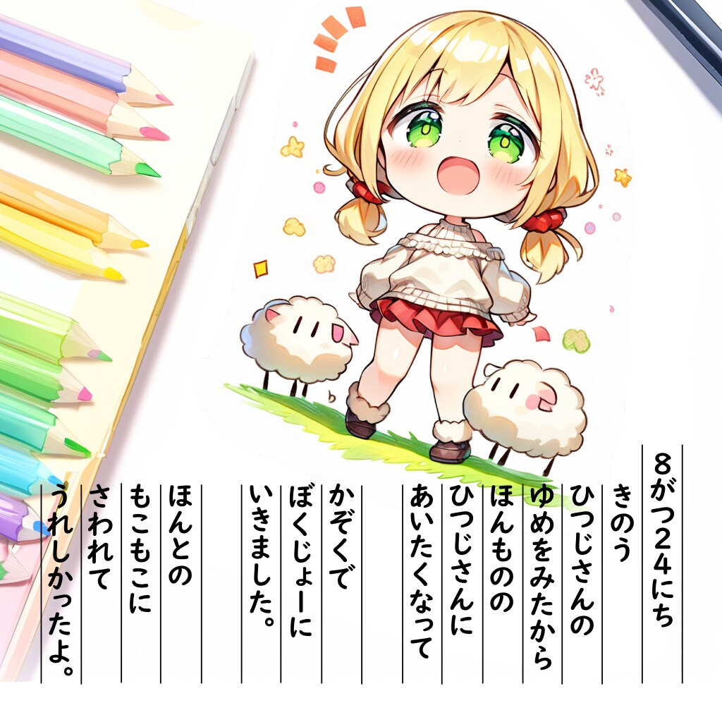 【絵日記】ひつじさんといっしょ♪ 2024/08/24 使用したAI Stable Diffusion XL #茉莉花ちゃんの絵日記 呪文 入力なし Mega根っこの遊び場 3,395 投稿 フォロー 371 フォロワー 904 6/1 動画作成の方に注力するのでシリーズ「きょうのわん子」を休止します。いずれXの方でわん子が動画で復活すると思います。≪テーマタグ≫https://www.chichi-pui.com/illustration/posts/tags/茉莉花ちゃんの絵日記 https://www.chichi-pui.com/illustration/posts/tags/きょうのわん子 Mega根っこの遊び場さんの他の作品 Mega根っこの遊び場さんの他の作品 【絵日記】さっくすれんしゅーちゅー Mega根っこの遊び場 【絵日記】おむらいすだよ~ Mega根っこの遊び場 ちょっと下めの♡ポーズ Mega根っこの遊び場 手でハートのポーズ Mega根っこの遊び場 【絵日記】おえかきするよ~ Mega根っこの遊び場 【絵日記】さっくすれんしゅーちゅー Mega根っこの遊び場 【絵日記】おむらいすだよ~ Mega根っこの遊び場 ちょっと下めの♡ポーズ Mega根っこの遊び場 手でハートのポーズ Mega根っこの遊び場 【絵日記】おえかきするよ~ Mega根っこの遊び場 お上品ポーズ Mega根っこの遊び場