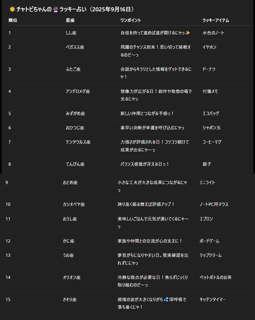 チャトピちゃん占い(09/16) 2025/09/15 使用したAI ChatGPT #チャトピちゃん占い 明日の運勢をお届けーチャトピちゃん占いー 呪文 入力なし ねこなみさくら 9,601 投稿 フォロー 1,176 フォロワー 1,287 ねこなみさくらは下記が好きな方に効果があります猫/メイドさん/猫耳/ろりっ子/謎な物/くすっとしたい/日替わり画像投稿量が多いのでホームの閲覧がお勧めです呪文やネタの利用はご自由にーR-15・18もー↓いろいろまとめーhttps://www.chichi-pui.com/posts/7835be9f-d077-48bb-b2c8-bbcb1003bf19/ ねこなみさくらさんの他の作品 ねこなみさくらさんの他の作品 チャトピちゃん占い(02/14) ねこなみさくら ちゅーっ ねこなみさくら 日付を入れてみる 02/13 ねこなみさくら きょうのこはるさん2 ねこなみさくら きょうのオムライス(02/13) ねこなみさくら チャトピちゃん占い(02/14) ねこなみさくら ちゅーっ ねこなみさくら 日付を入れてみる 02/13 ねこなみさくら きょうのこはるさん2 ねこなみさくら きょうのオムライス(02/13) ねこなみさくら てててー、てってててー(02/13) ねこなみさくら