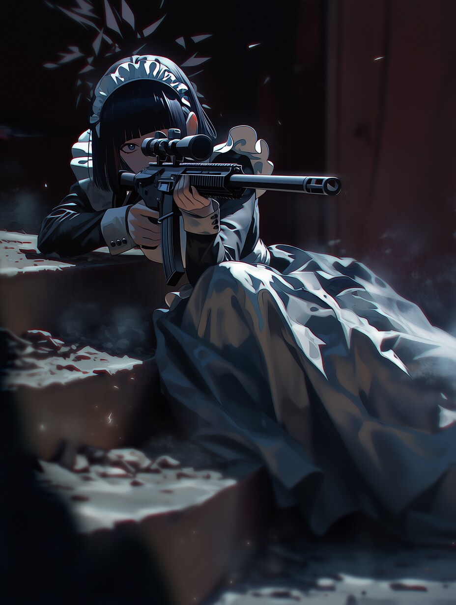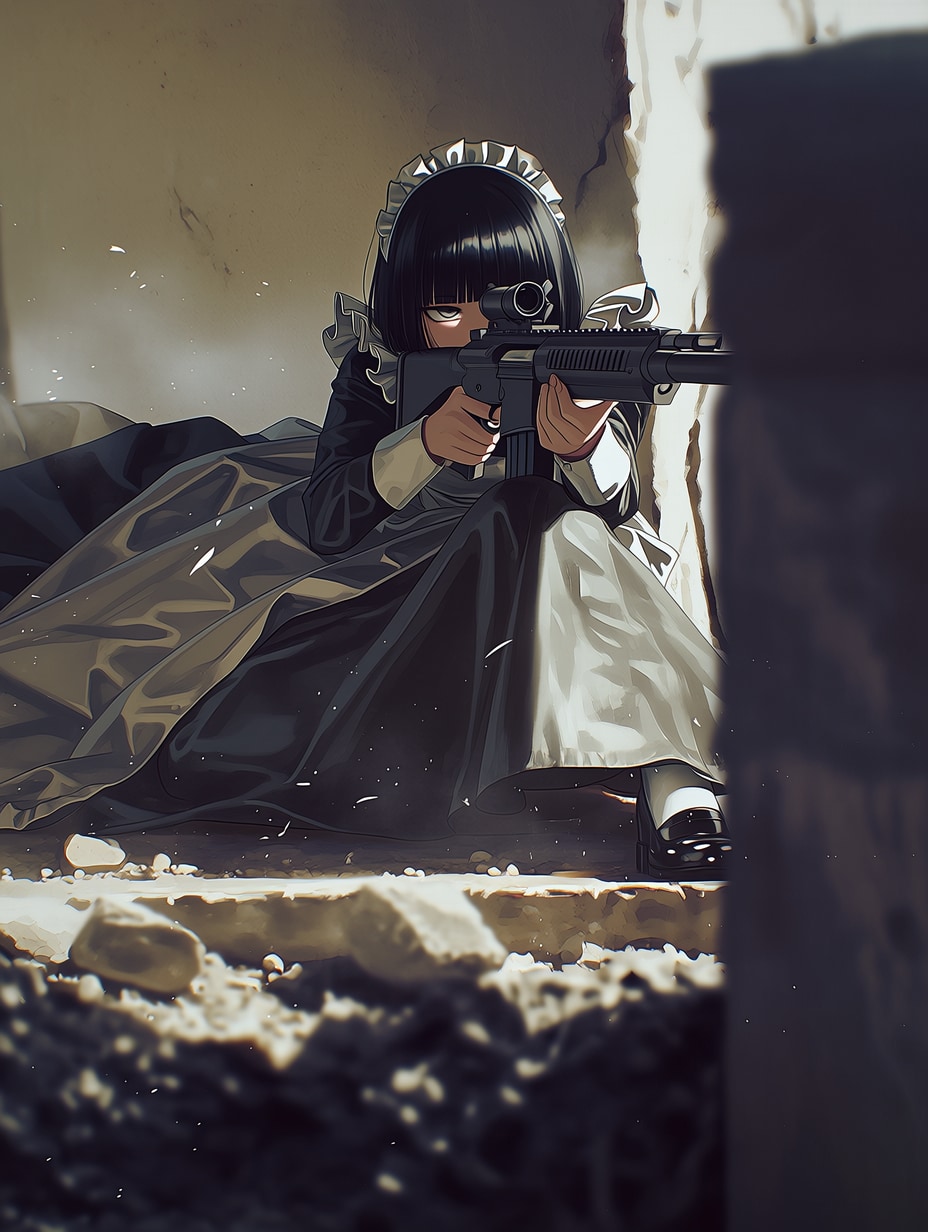 段差に隠れて銃を構えるメイドを作ろうとしました。