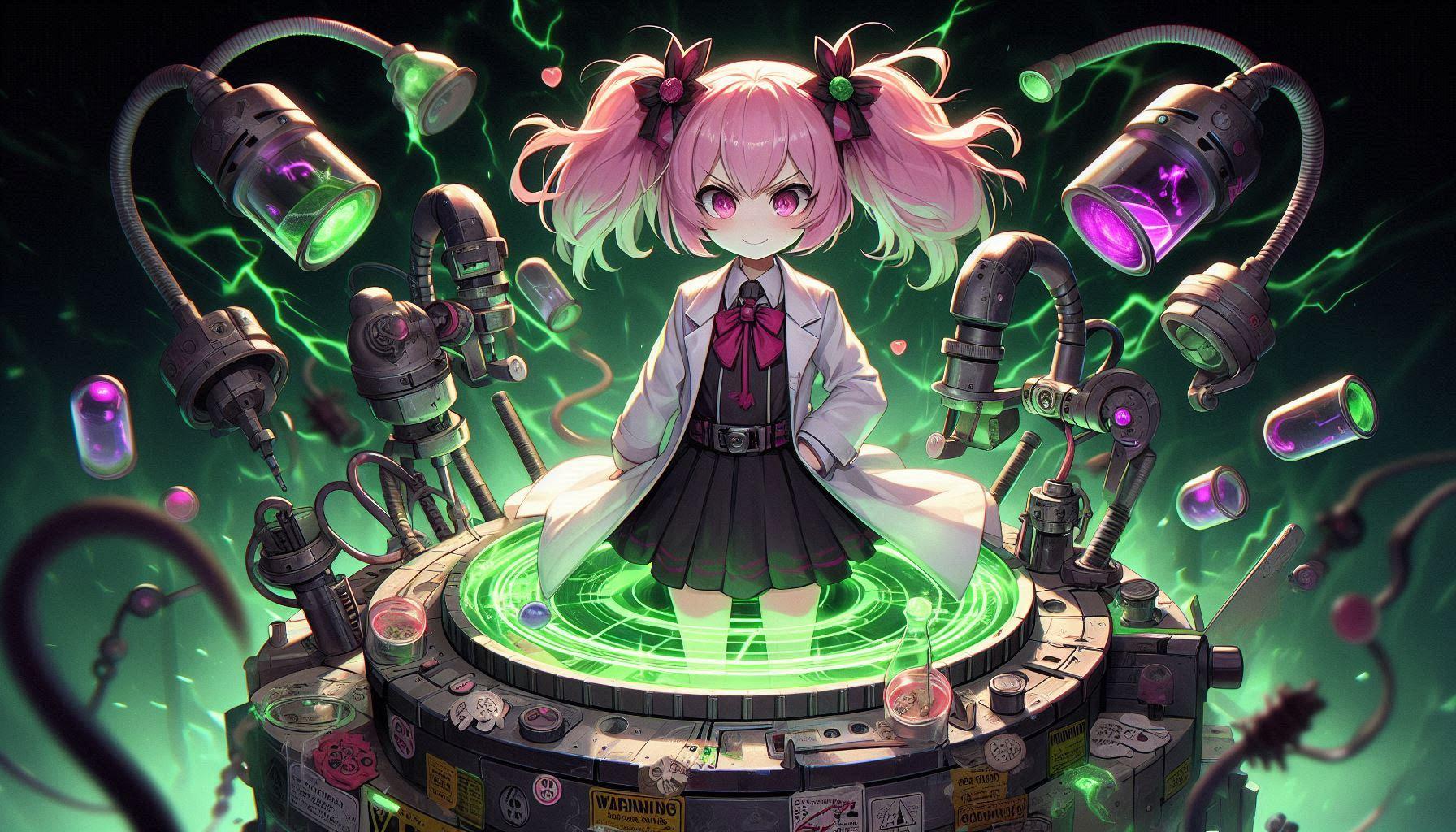 意図:明らかに危険そうな実験が進行中なのに、なぜか自信満々でドヤ顔を決める幼き狂科学者。