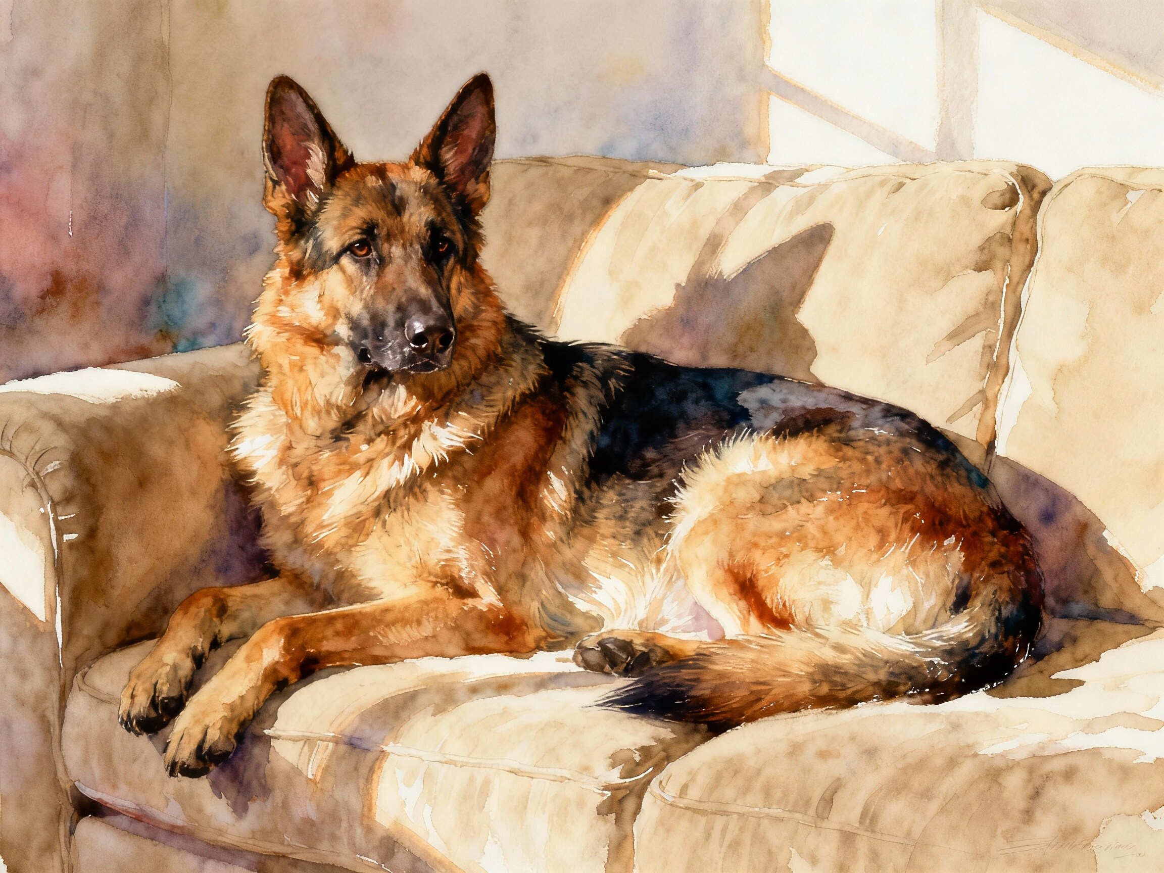 ソファーでくつろぐジャーマンシェパード ー#Seedream 試作画像ー