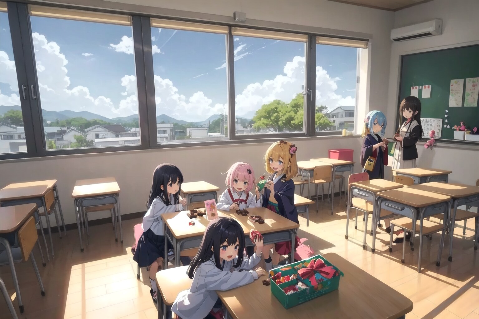 机の上に並んだ、カラフルなチョコレート。小さな手でそっと置かれたそれは、みんながドキドキしながら準備した大切な贈り物。「せんせー、まだかなー?」と、椅子に座りながらそわそわ。隣の子と顔を見合わせて、「早く渡したいね」と小さくささやく。包み紙のリボンを指でくるくるしながら、先生が来るのを今か今かと待っている。幼い心に芽生えた、特別な日のわくわく。もうすぐ、大好きな先生の笑顔が見られる――。