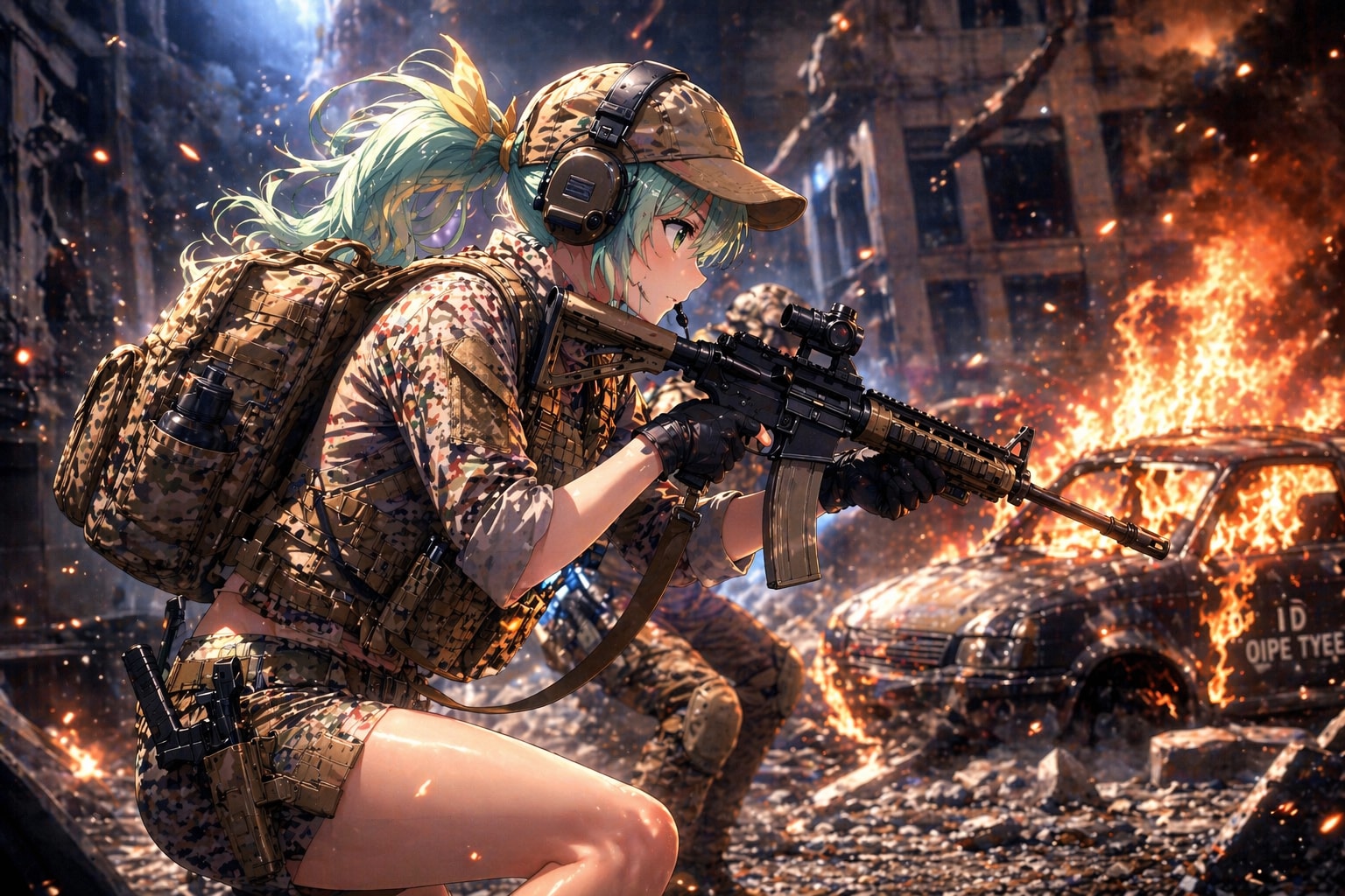 崩壊した都市の熱と煙の中、彼女は一瞬の迷いもなく引き金に指をかける。