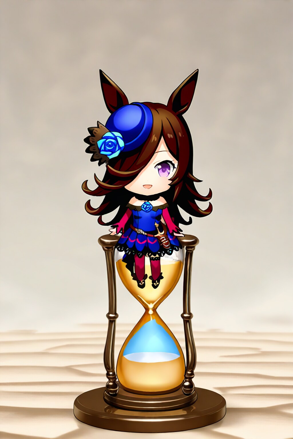 砂浜で巨大な砂時計の砂面に立つライスシャワー