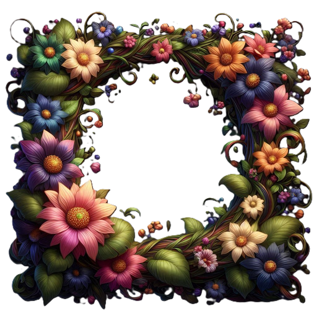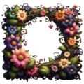 暗い背景に小花と葉が描かれたカラフルな花と1本のつるでできたフレーム。