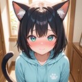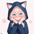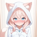 1girl, cat ears, nekomimi, wearing hood, looking shy, blushing, cute, looking at viewer, masterpiece, ultra detailed, feline features, fluffy tail, innocent expression, playful pose, pastel colors
