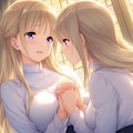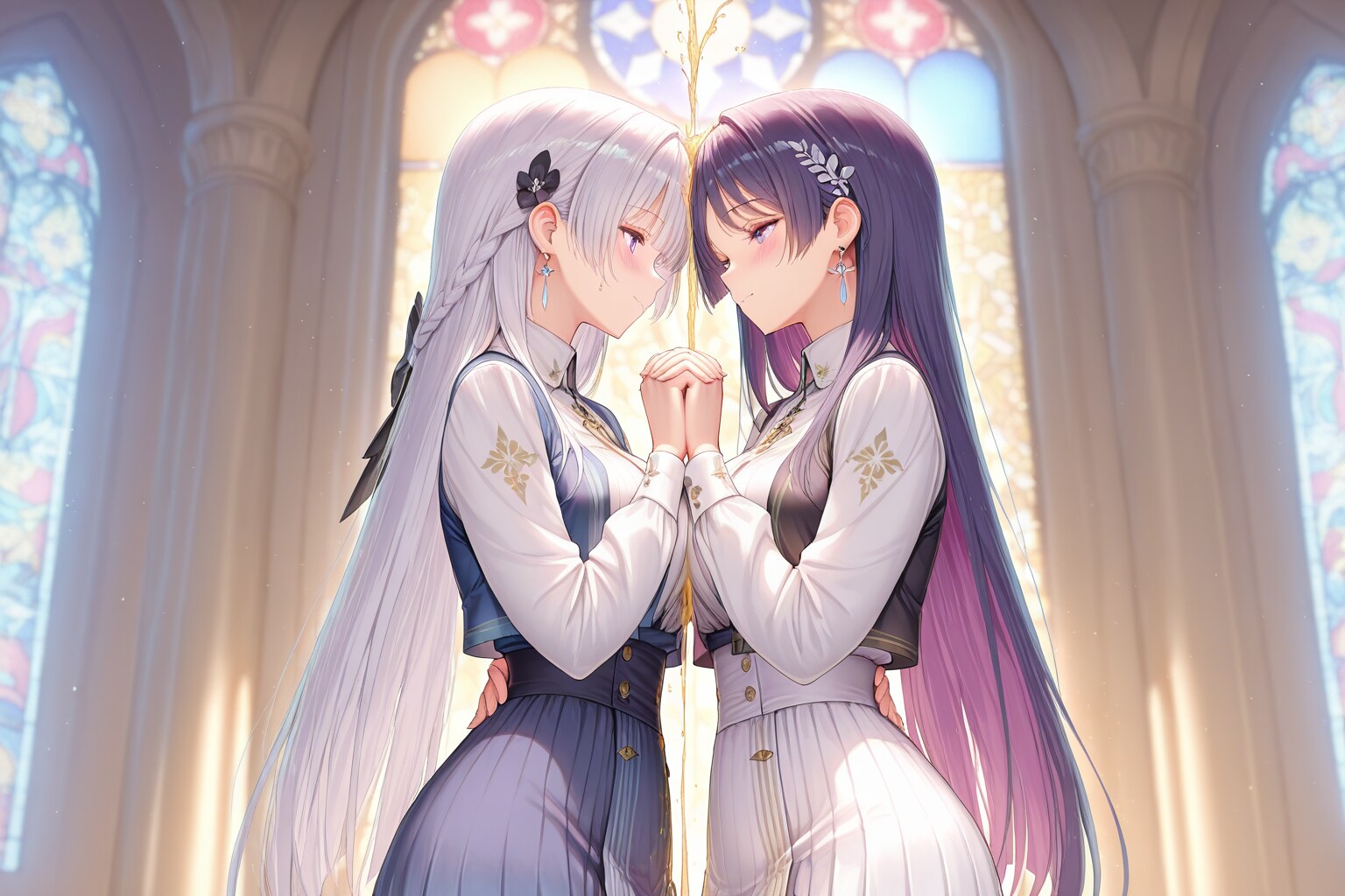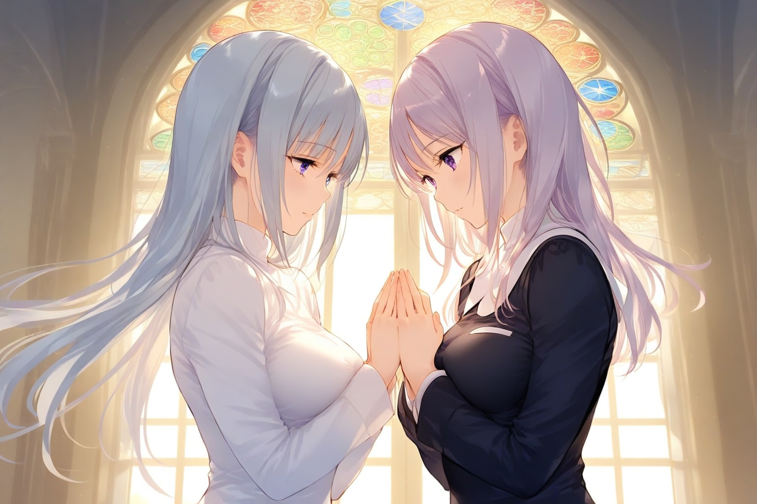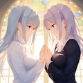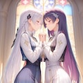 シスターというか聖女というか、二人で手を繋いでお祈りという場面を想定してプロンプトを組んでみたんだけど……。