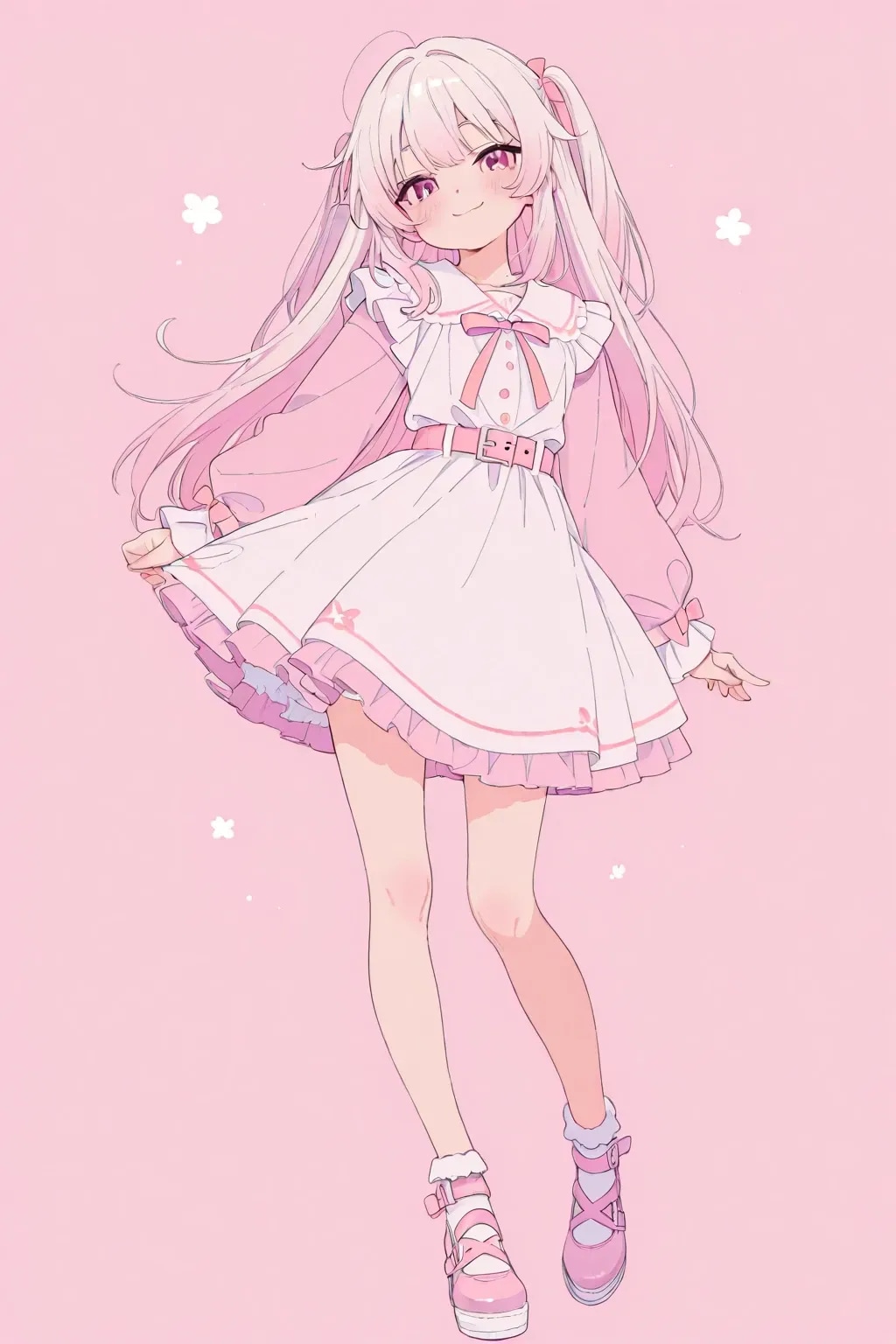 最高傑作、超高解像度、8K、超ハイクオリティ、高精細ディテール、日本人、キュート、可愛い、美少女、女の子、可愛い目、ストレートロングヘア、ピンクカラー、ガーリーワンピース、パステルカラー、ベルトシューズ、ファンタジーで可愛い街、
