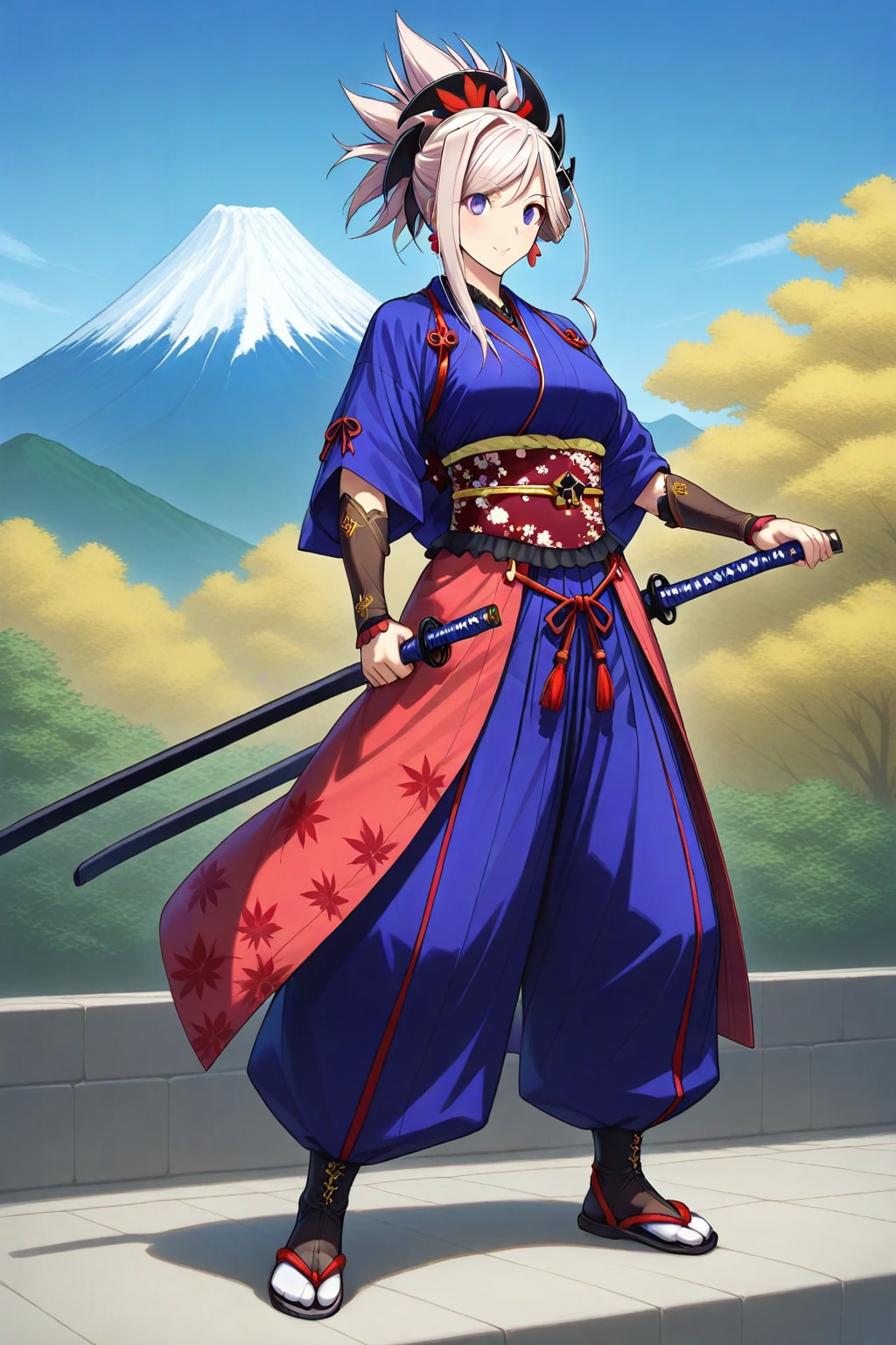 富士の峰が悠然とそびえ、緑の木々が風に揺れる。青の着物をまとい、銀髪をなびかせる彼女は、静かに刀を握り締めた。腰にはもう一本の刃。その鋭い眼差しは、戦う覚悟を映し出している。決して感情を荒げることはない。だが、確かに聞こえる——心の内に燃える炎の音が。対峙する相手は未だ見えず、だが迷いはない。静寂の中、ただ一陣の風が、彼女の裾を揺らした。