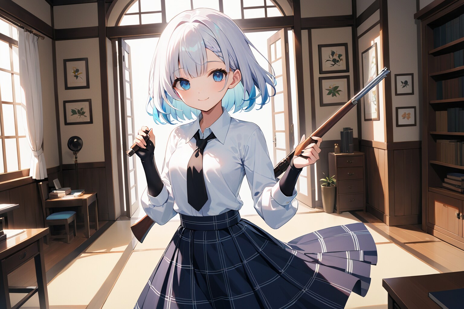 朝陽が探偵事務所の窓から差し込み、室内を柔らかく照らす。そこに立つのは一人の美少女。白髪のボブヘアが、光を浴びてさらに輝きを増している。大きなアーモンド型の青い瞳はどこか知的でありながら、温かさも感じさせる。白いワイシャツに黒いネクタイ、そして黒いチェック柄のスカートというクラシカルな装いが、彼女の探偵らしさを強調している。