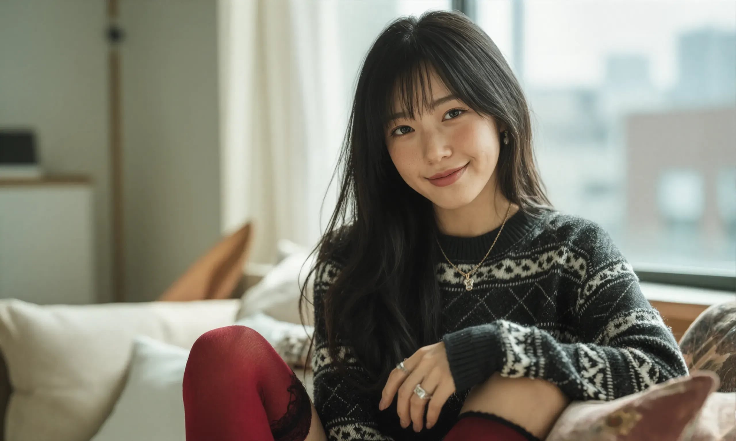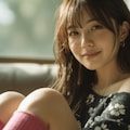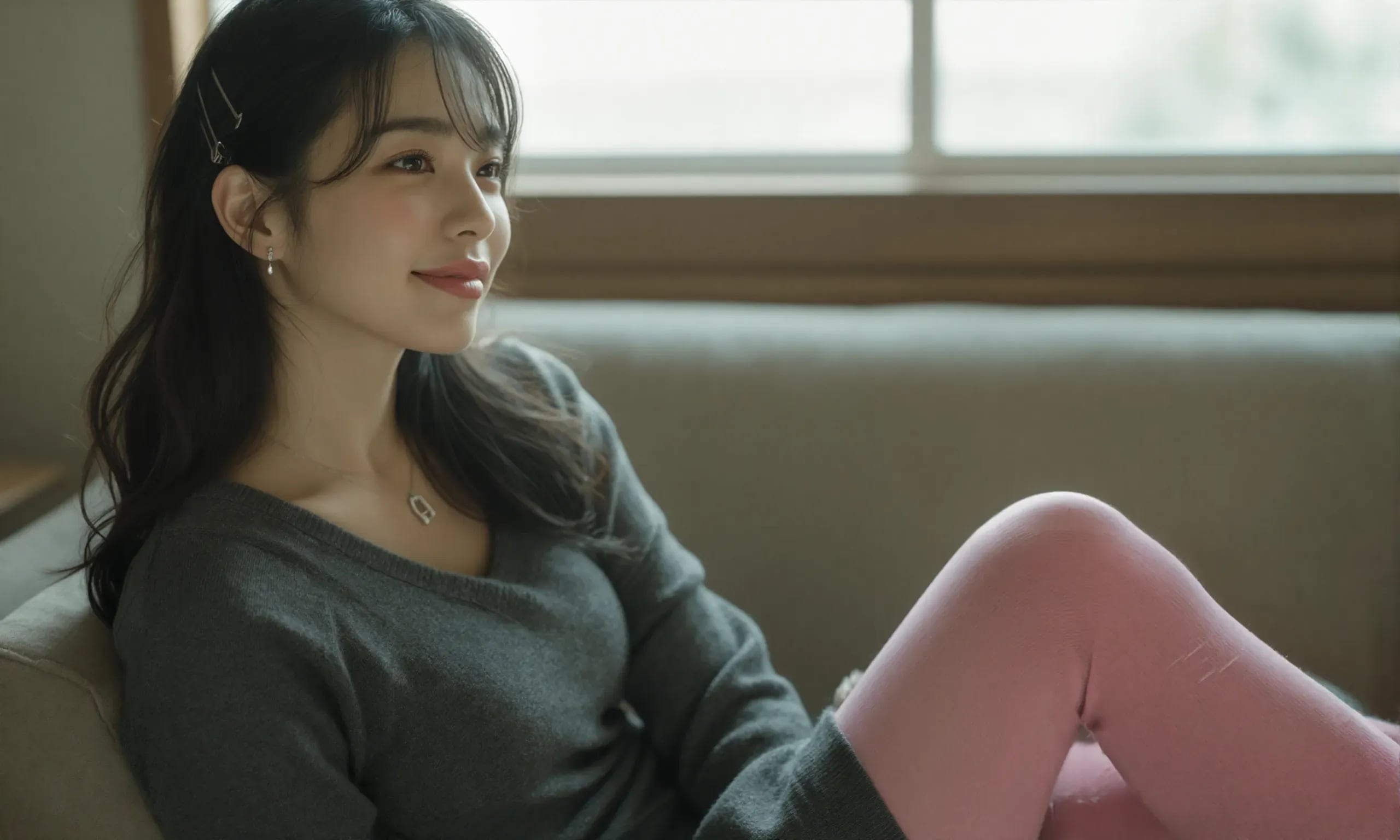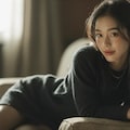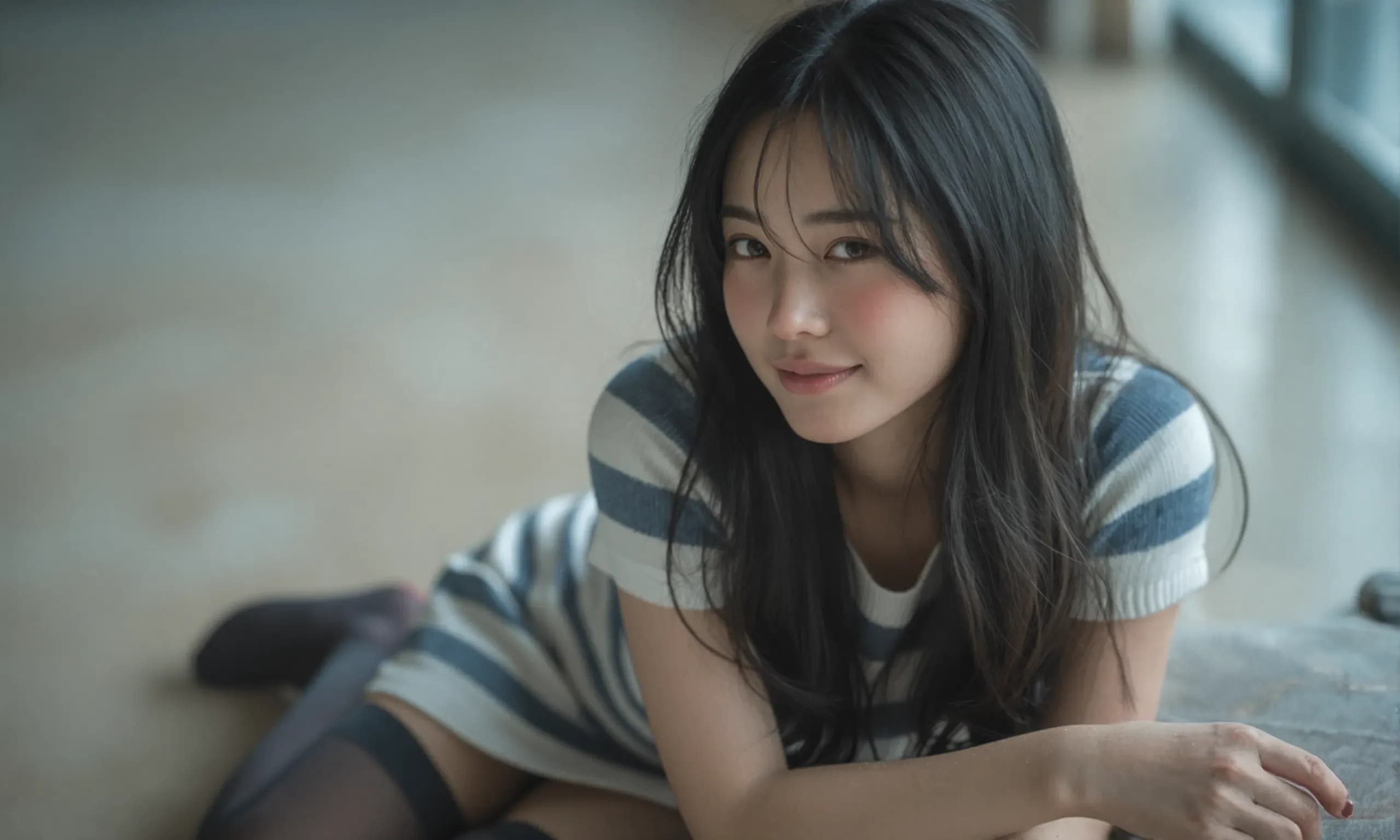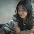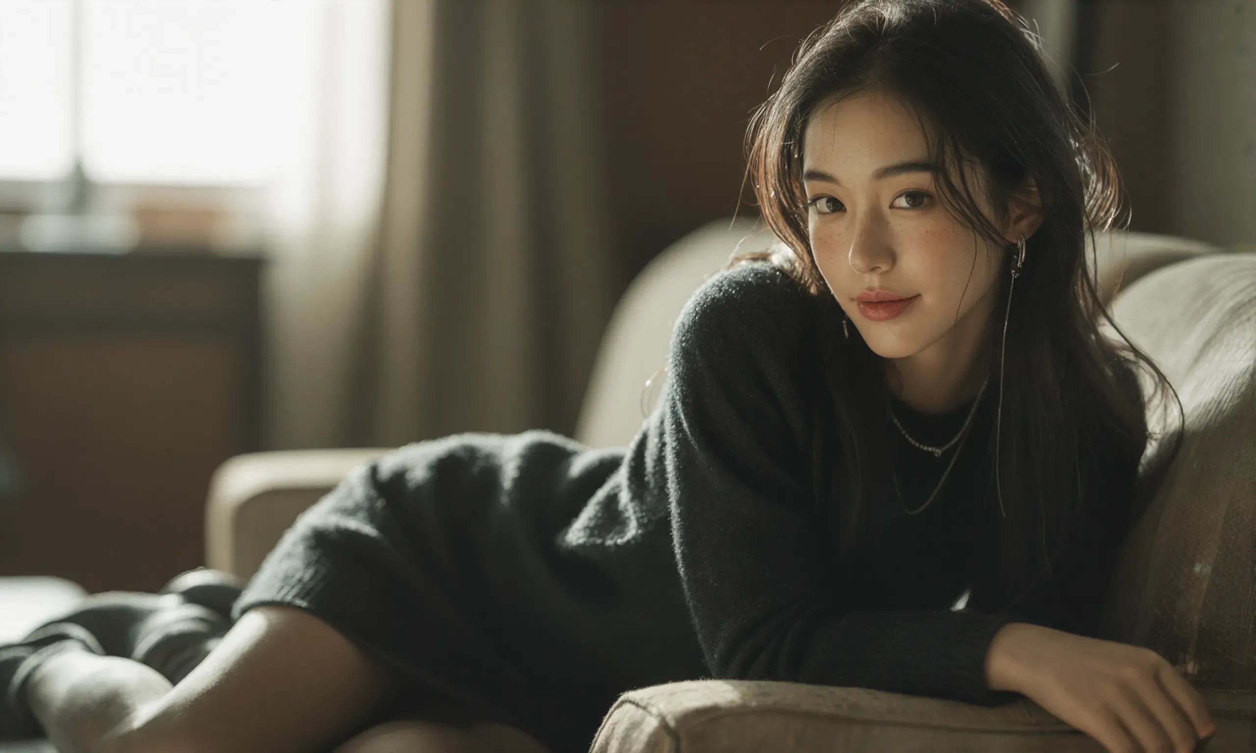 The photograph follows the "Off-Center Composition" principle with the subject positioned on the right side of the frame, while maintaining negative space on the left. A telephoto lens is used for the shot; specifically, it captures the upper body from approximately waist height upwards, focusing sharply on her face and torso to ensure clarity and detail.