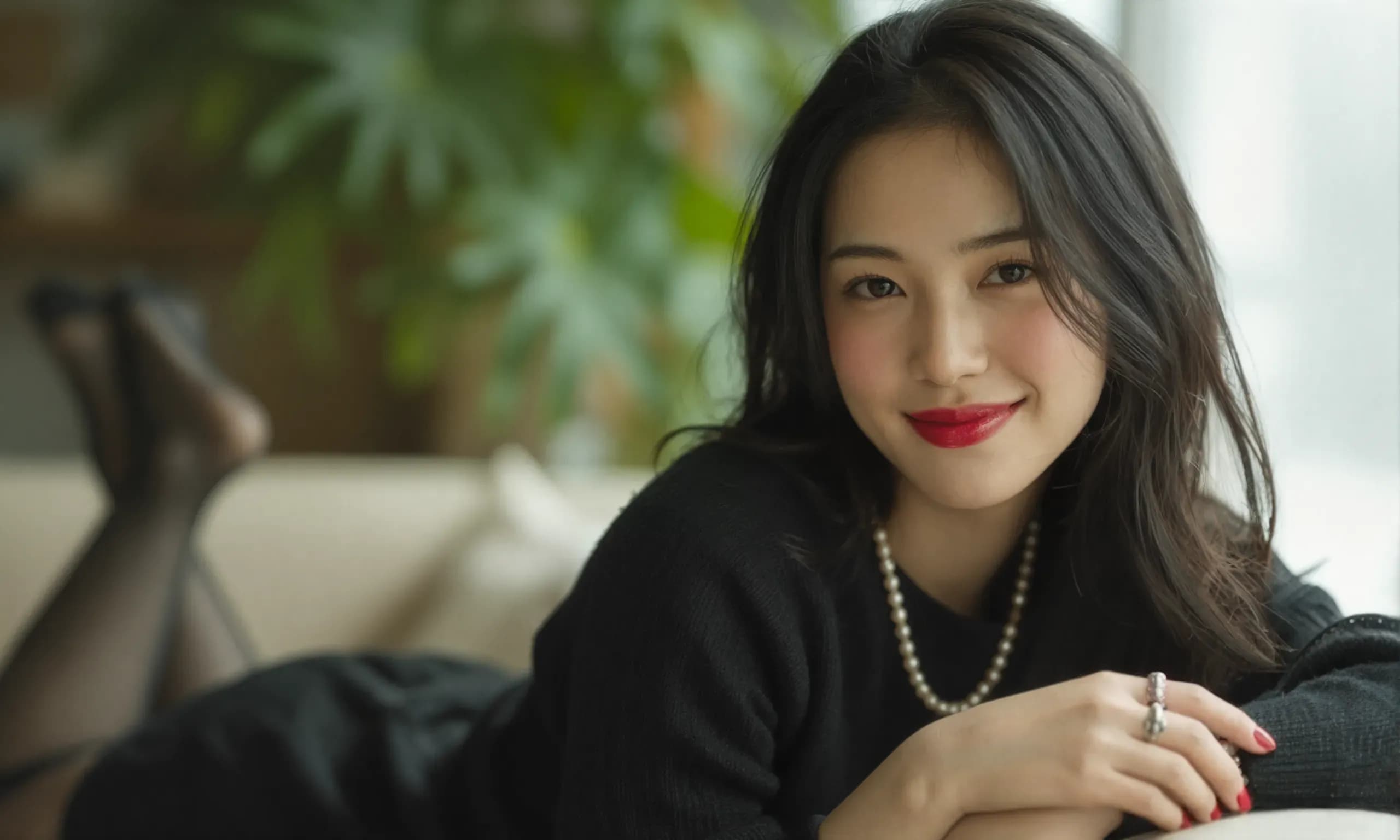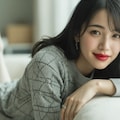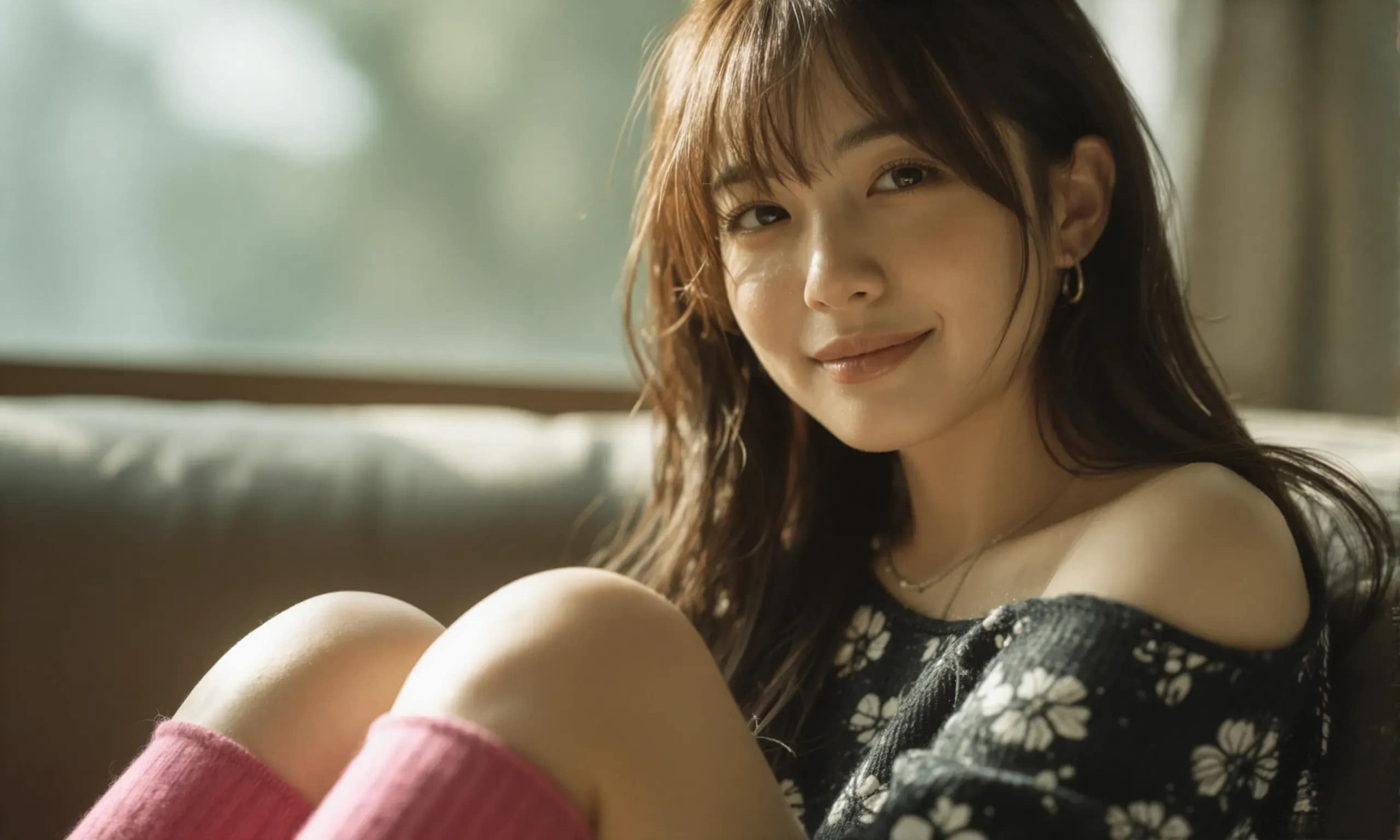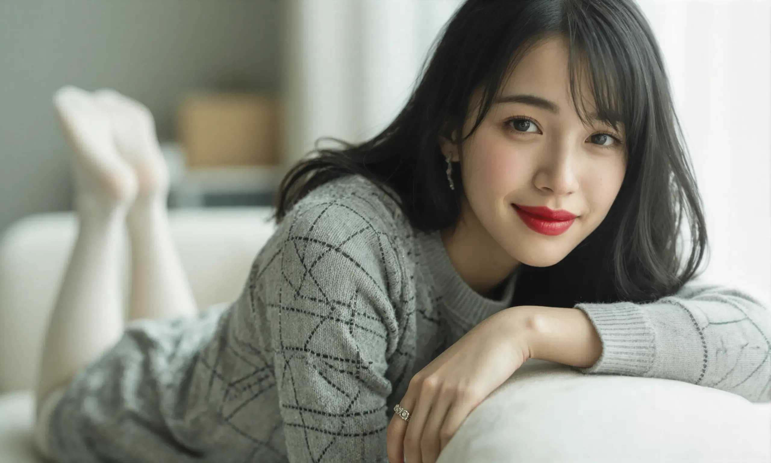 The photograph follows the "Off-Center Composition" principle with the subject positioned on the right side of the frame, while maintaining negative space on the left. A telephoto lens is used for the shot; specifically, it captures the upper body from approximately waist height upwards, focusing sharply on her face and torso to ensure clarity and detail.