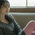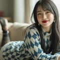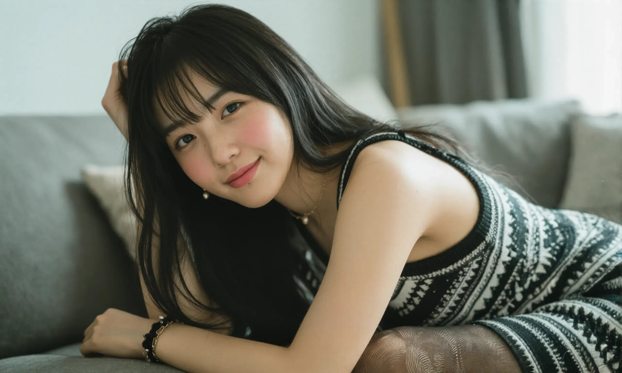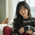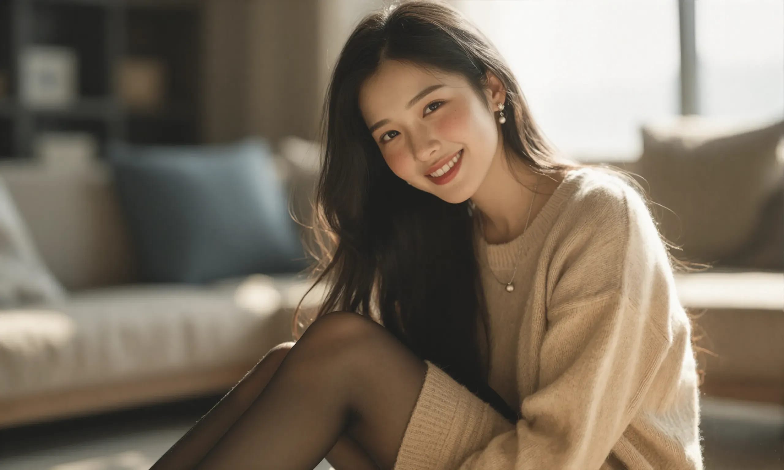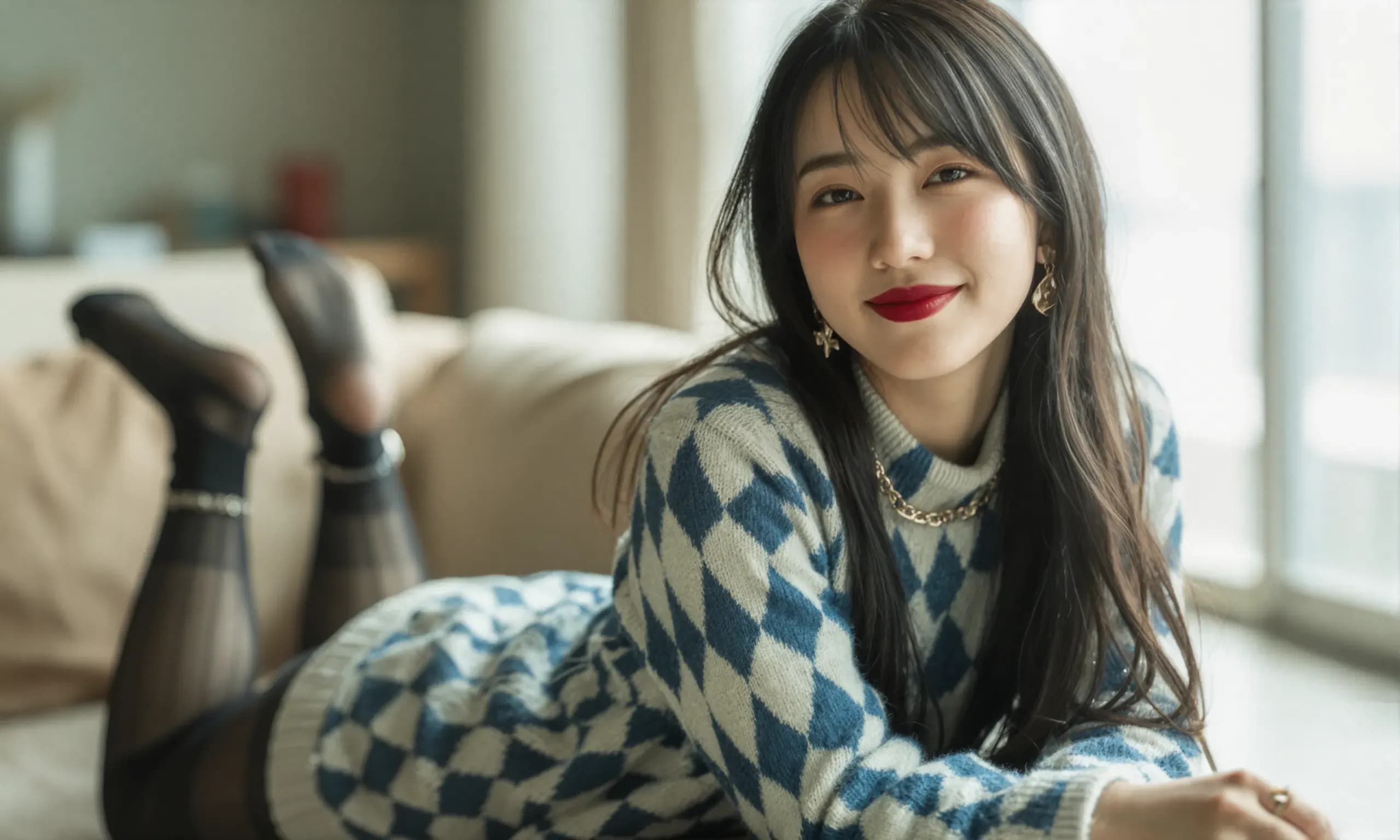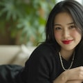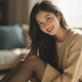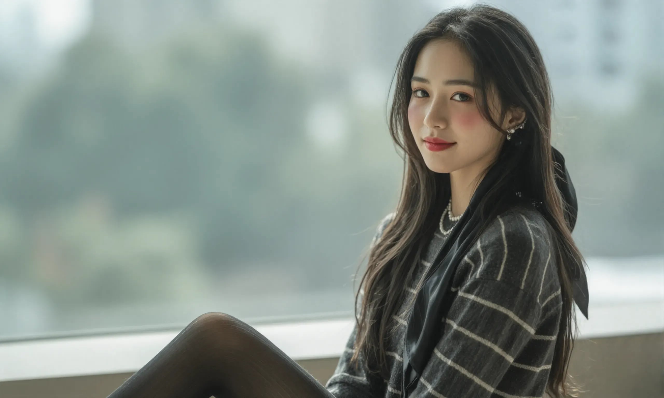 The photograph follows the "Off-Center Composition" principle with the subject positioned on the right side of the frame, while maintaining negative space on the left. A telephoto lens is used for the shot; specifically, it captures the upper body from approximately waist height upwards, focusing sharply on her face and torso to ensure clarity and detail.