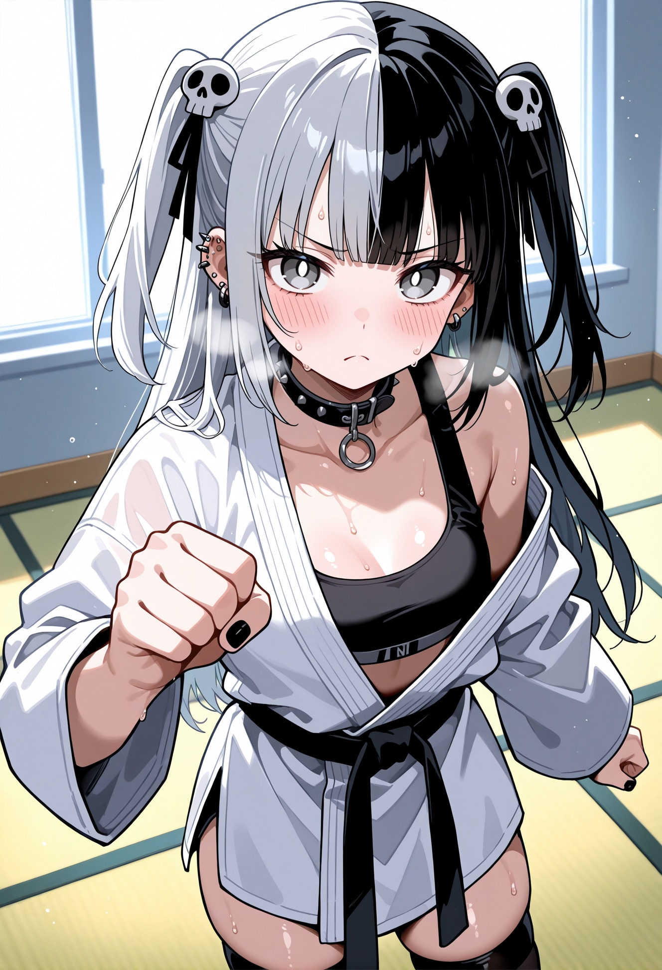 jacket partially removed, heart in eye, burnt clothes, holding fishing rod, kanji, doujin cover, pentagram, tape gag, adjusting headwear, red socks, friends, cloud print, coke-bottle glasses, oral invitation, competition school swimsuit, barbell piercing, gradient legwear, prisoner, blood on breasts, wind chime, carrying over shoulder, tape measure, flaming weapon
