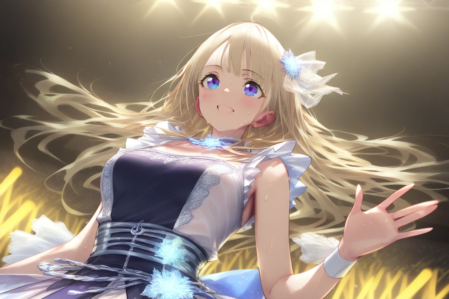 コンサートのステージで激しく動いた後の、アイドル/アイドルたちのオフショット。