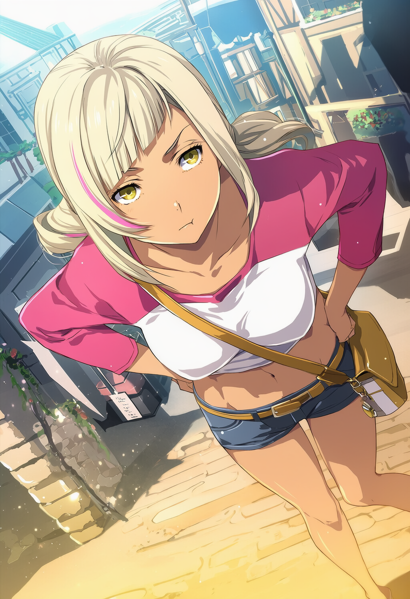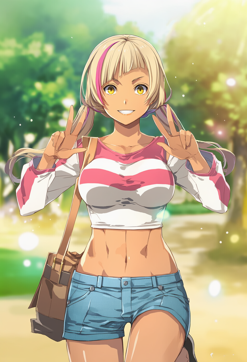 girl,diagonal bangs,low twintails,beige hair,streaked pink hair,dark skin,shiny skin,shiny hair,yellow eyes,perky breasts,casual,long sleeves,t-shirt,short jeans,two-tone shirt,navel,abs,